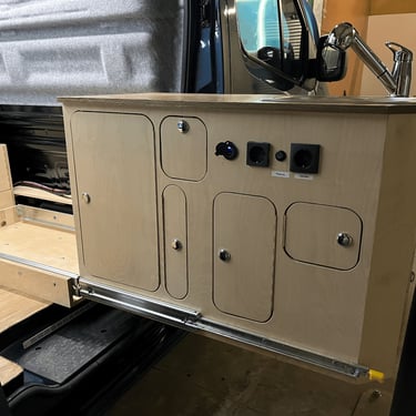 Un meuble cuisine sur rail pour pouvoir cuisiner en extérieur l'été.